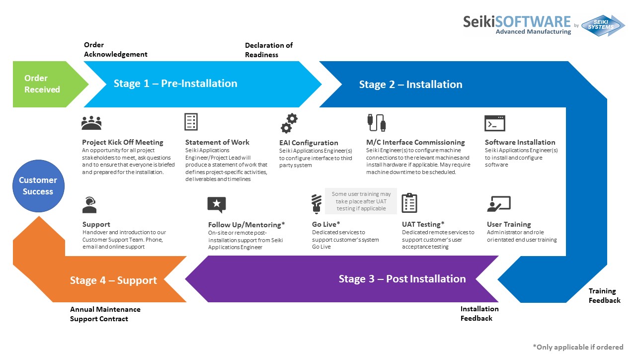 Our experienced team can help you take those critical steps towards a more efficient, flexible and connected factory. We fully support the implementation process, starting with a project kick off meeting with your Seiki account manager and lead engineer. The resulting Statement of Work/Project Plan will provide full visibility of critical milestones for all parties. The team will then support through the installation, training, user acceptance and Go Live.